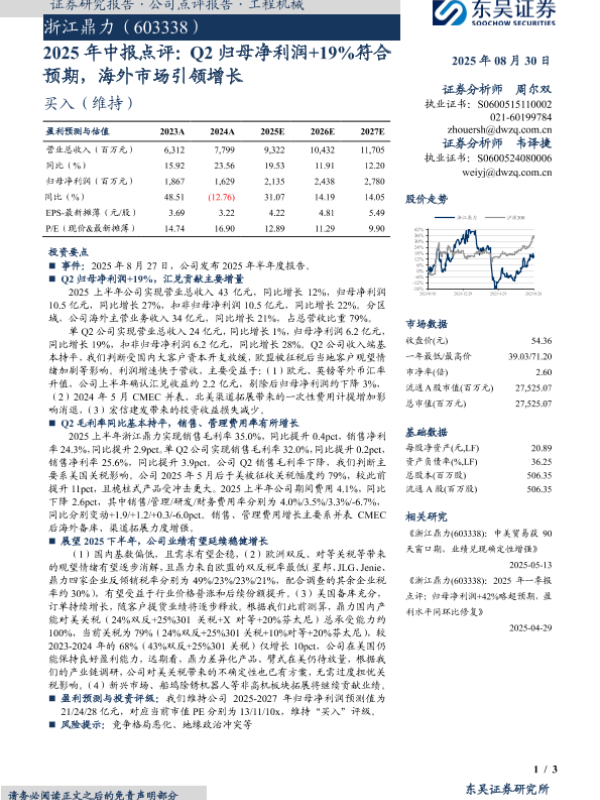 【东吴证券】【20250830】浙江鼎力(603338)-2025年中报点评:Q2归母净利润+19%符合预期,海外市场引领增长-3页