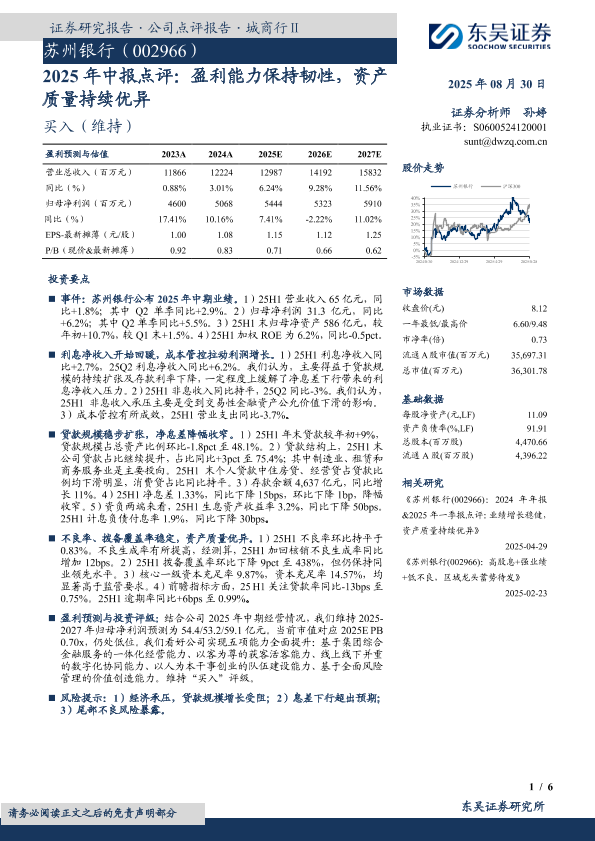 【东吴证券】【20250830】苏州银行-2025年中报点评:盈利能力保持韧性,资产质量持续优异-6页