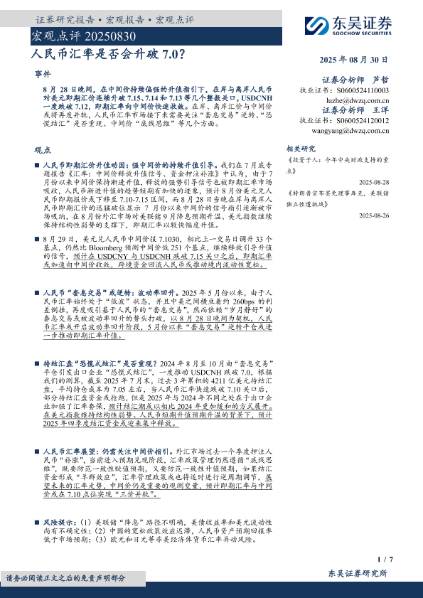 【东吴证券】【20250830】人民币汇率是否会升破7.0?-7页