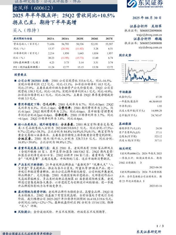 【东吴证券】【20250830】老凤祥-2025年半年报点评:25Q2营收同比+10.5% 拐点已至,期待下半年高增-3页