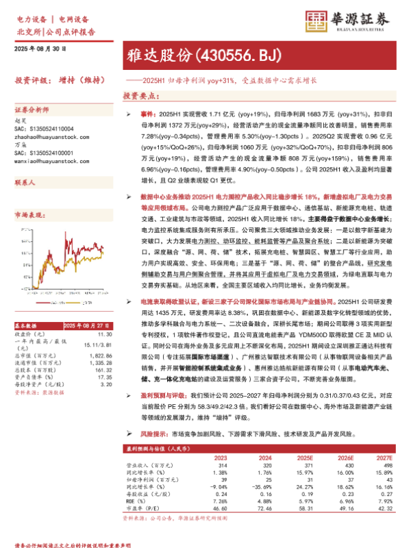 【华源证券】【20250830】雅达股份-2025H1归母净利润 yoy+31%,受益数据中心需求增长-3页