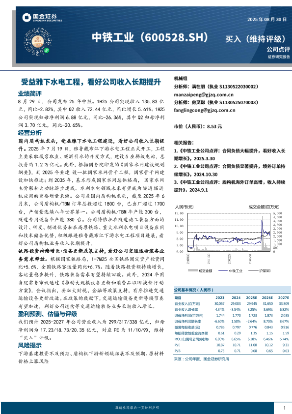 【国金证券】【20250830】中铁工业-受益雅下水电工程-看好公司收入长期提升-4页