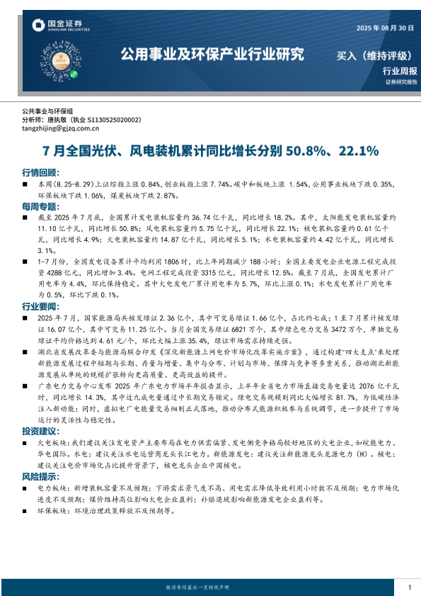 【国金证券】【20250830】公用事业及环保产业行业周报-7月全国光伏_风电装机累计同比增长分别50.8_22.1-16页