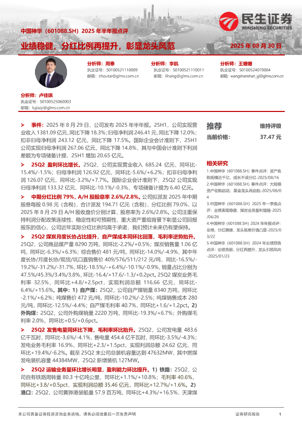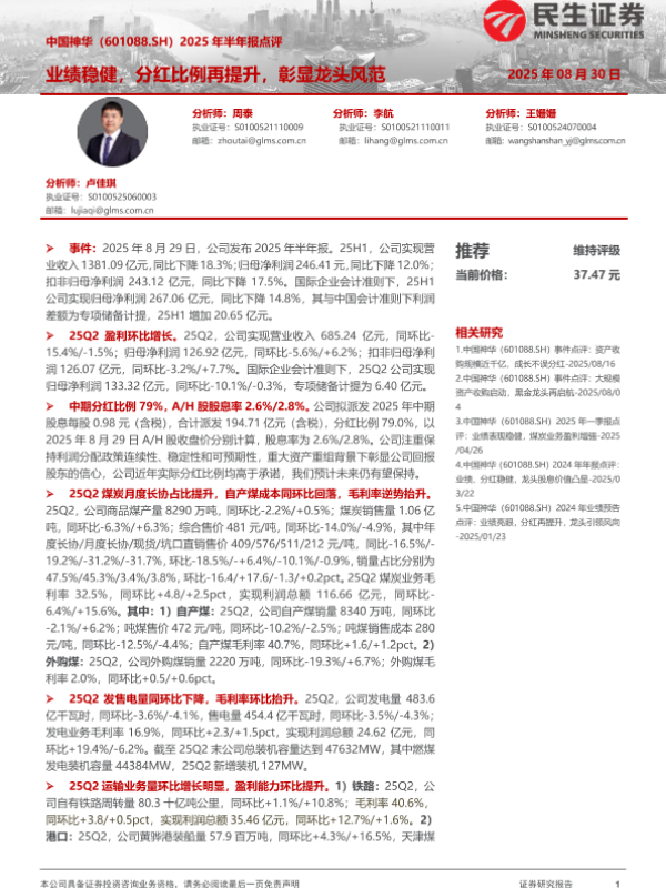【民生证券MINSHENG SECURITIES】【20250830】中国神华-业绩稳健,分红比例再提升,彰显龙头风范-4页