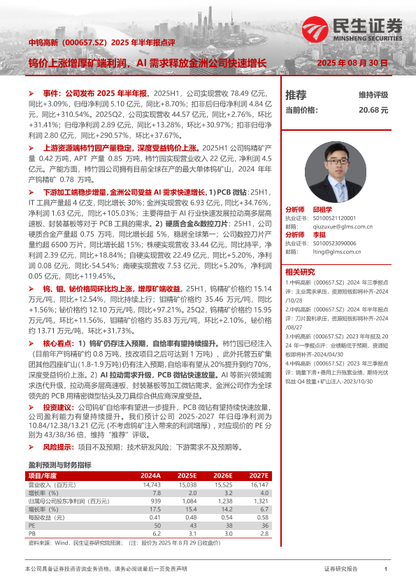 【民生证券】【20250830】中钨高新-钨价上涨增厚矿端利润,AI需求释放金洲公司快速增长-3页