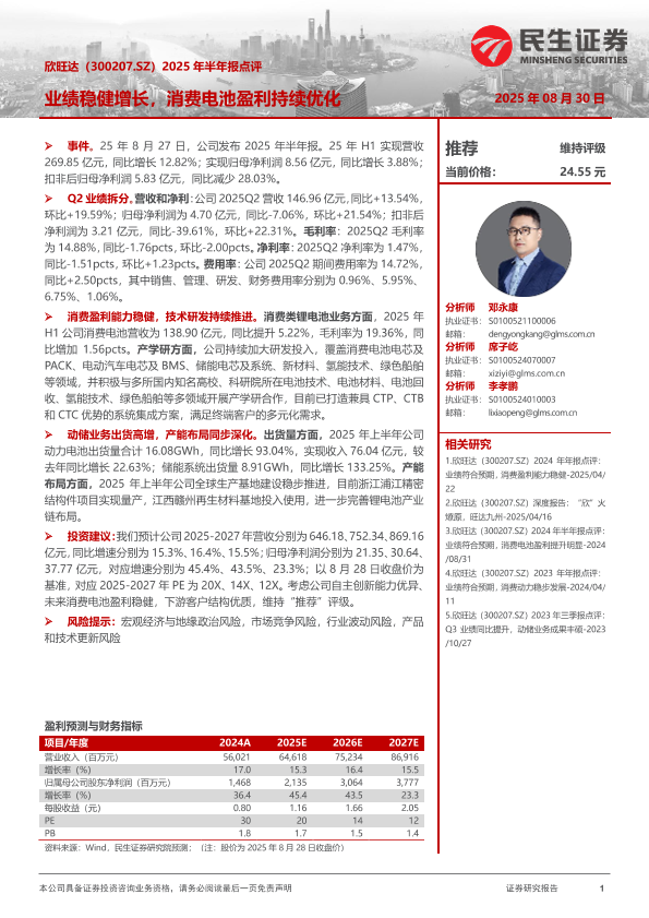 【欣旺达(300207.SZ)】【20250830】欣旺达-2025年半年报点评-业绩稳健增长-消费电池盈利持续优化-3页