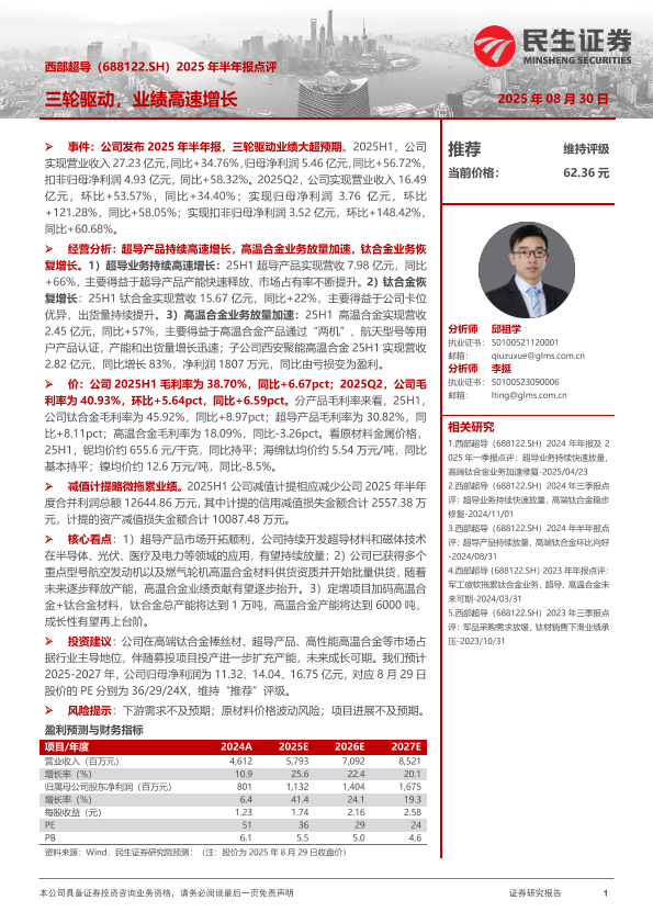 【民生证券】【20250830】西部超导-2025年半年报点评_三轮驱动_业绩高速增长-3页