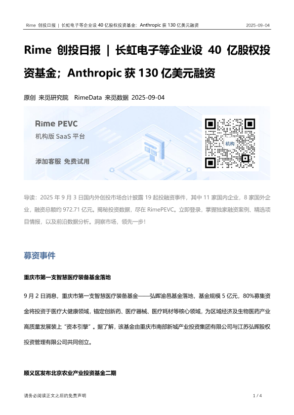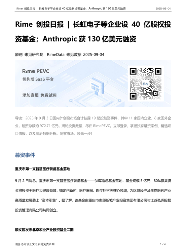 【RimeData】【20250904】Rime创投日报 - 长虹电子等企业设40亿股权投资基金;Anthropic获130亿美元融资-4页