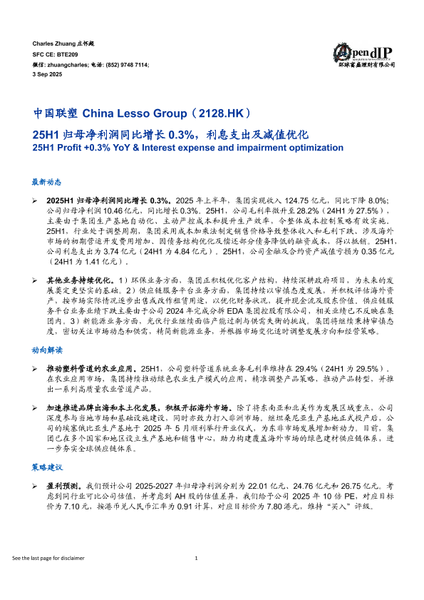 【Charles Zhuang庄怀超】【20250903】中国联塑-25H1归母净利润同比增长0.3%,利息支出及减值优化-6页
