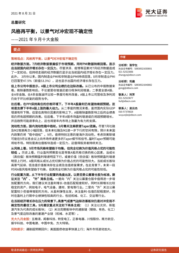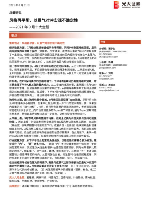 【光大证券】【20210831】2021年9月十大金股:风格再平衡,以景气对冲宏观不确定性-15页