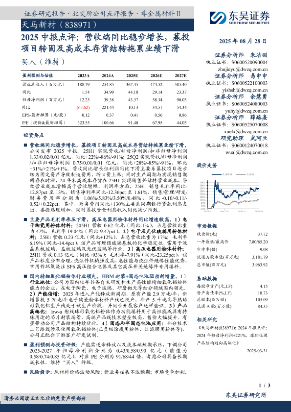 【东吴证券】【20250828】天马新材(838971)-2025中报点评:营收端同比稳步增长,募投项目转固及高成本存货结转拖累业绩下滑-3页