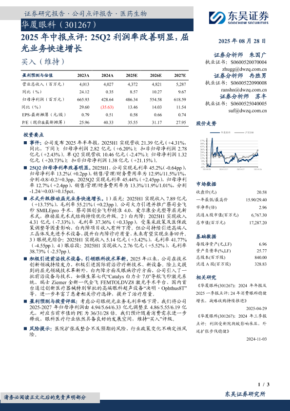 【东吴证券】【20250828】华厦眼科-2025年中报点评:25Q2利润率改善明显-屈光业务快速增长-3页