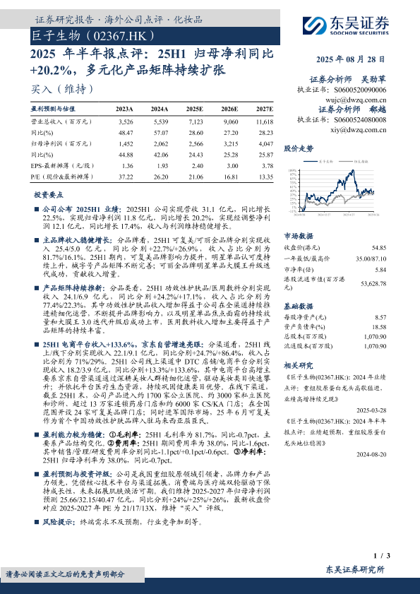 【东吴证券】【20250828】巨子生物-2025年半年报点评:25H1归母净利同比 +20.2%,多元化产品矩阵持续扩张-3页
