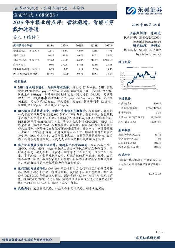 【东吴证券】【20250828】恒玄科技-2025年中报业绩点评:营收稳增,智能可穿戴加速渗透-3页