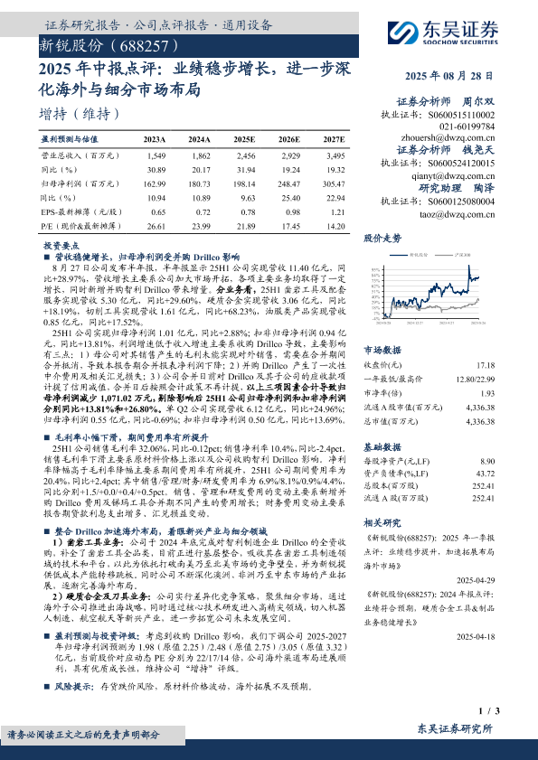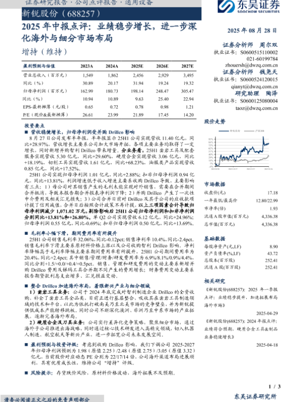 【东吴证券】【20250828】新锐股份-2025年中报点评:业绩稳步增长-进一步深化海外与细分市场布局-3页