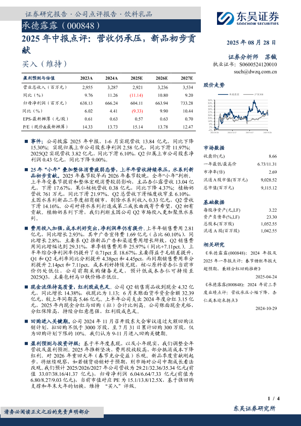 【东吴证券】【20250828】承德露露-2025年中报点评:营收仍承压,新品初步贡献-4页