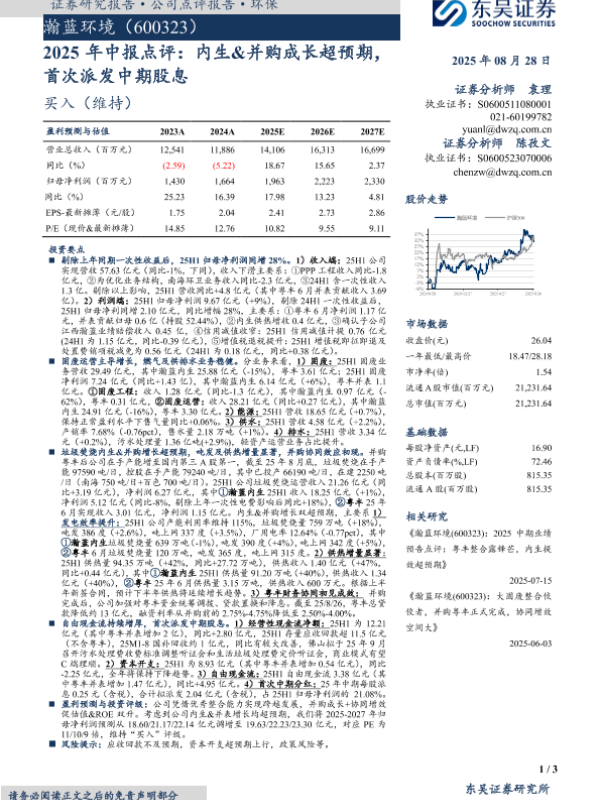 【东吴证券】【20250828】瀚蓝环境-2025年中报点评:内生&并购成长超预期,首次派发中期股息-3页