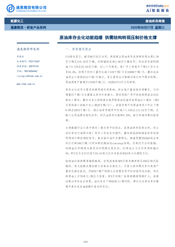 【通惠期货有限公司】【20250827】原油库存去化动能趋缓-供需结构转弱压制价格支撑-10页