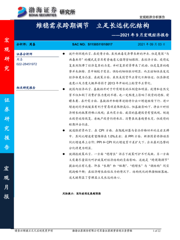 【渤海证券】【20210903】2021年9月宏观经济报告:维稳需求跨期调节,立足长远优化结构-22页