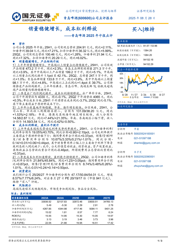【国元证券】【20250828】青岛啤酒-销量稳健增长,成本红利释放-3页