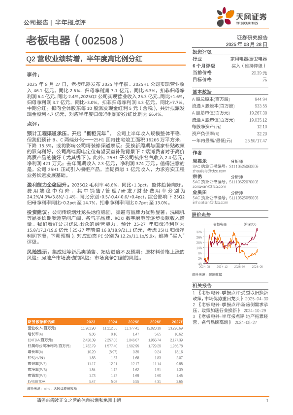 【天风证券】【20250828】老板电器-002508.SZ-Q2营收业绩转增-半年度高比例分红-3页