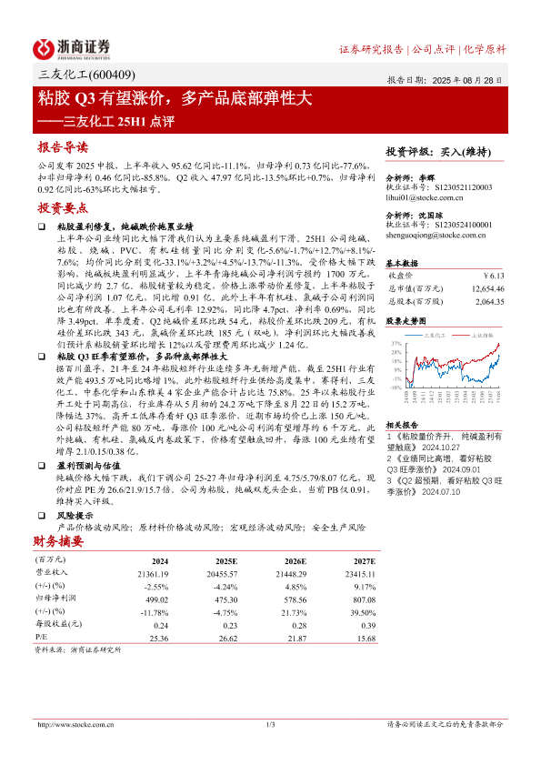 【浙商证券】【20250828】三友化工-粘胶 Q3有望涨价,多产品底部弹性大-3页