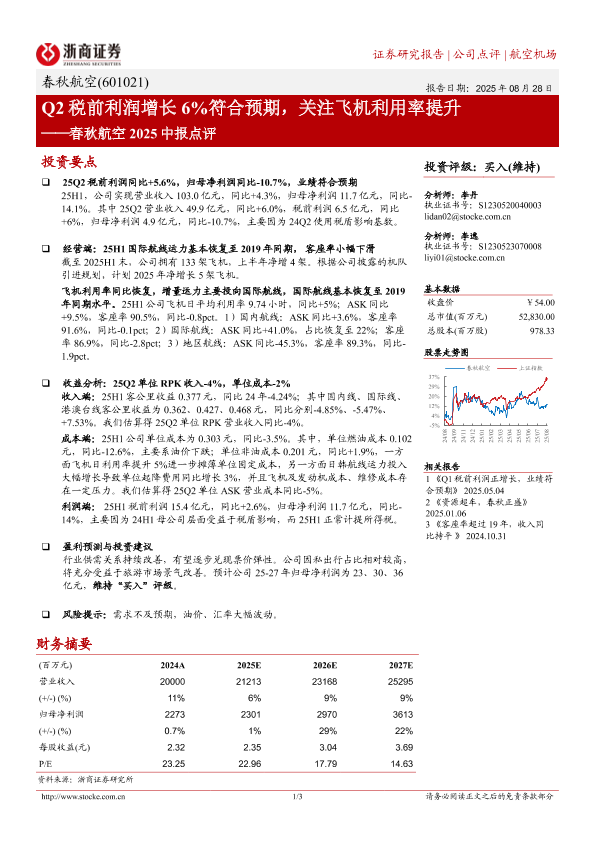 【浙商证券】【20250828】春秋航空-Q2税前利润增长6%符合预期,关注飞机利用率提升-3页