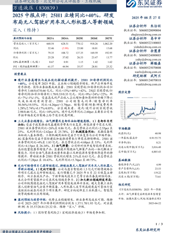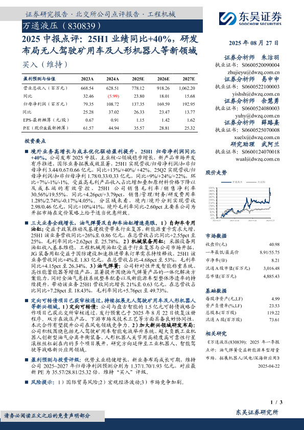 【东吴证券】【20250827】万通液压-2025中报点评:25H1业绩同比+40%,研发布局无人驾驶矿用车及人形机器人等新领域-3页