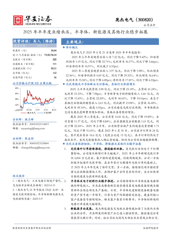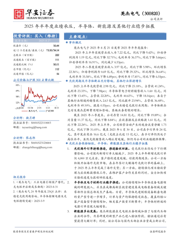 【华安证券】【20250827】英杰电气-2025年半年度业绩承压-半导体、新能源及其他行业稳步拓展-4页