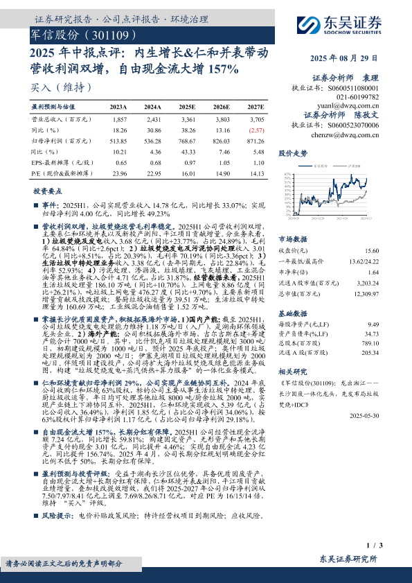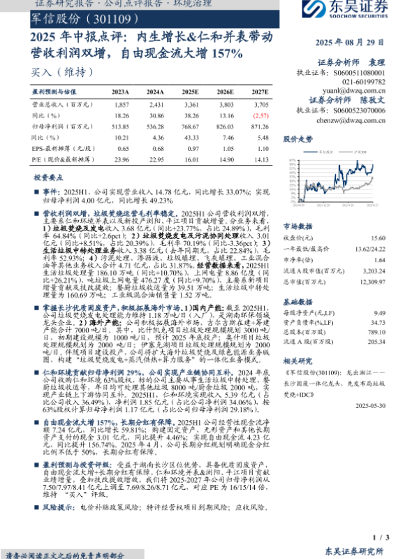 【东吴证券】【20250829】军信股份-2025年中报点评:内生增长&仁和并表带动营收利润双增,自由现金流大增157%-3页