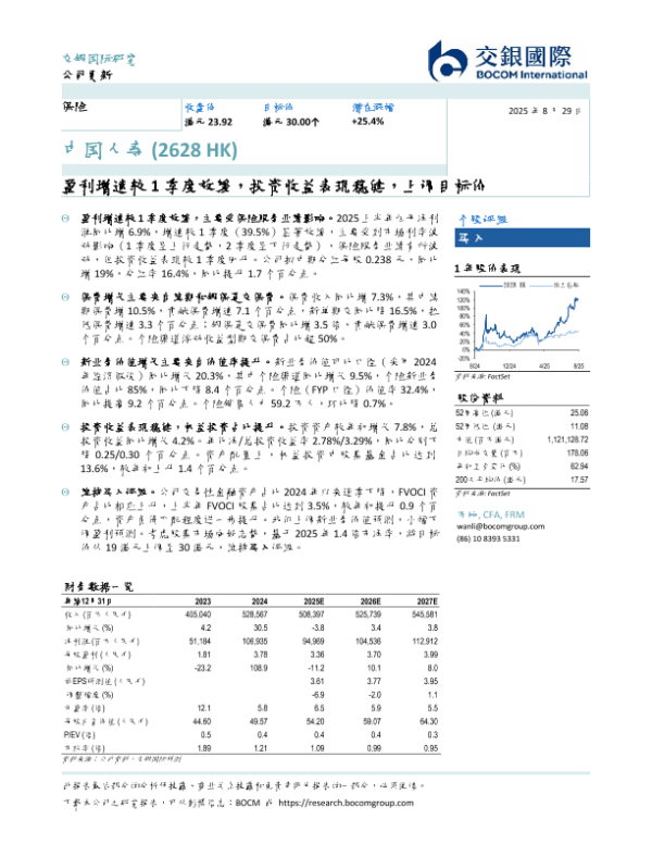 【交银国际研究】【20250829】中国人寿-盈利增速较1季度放缓_投资收益表现稳健_上调目标价-6页