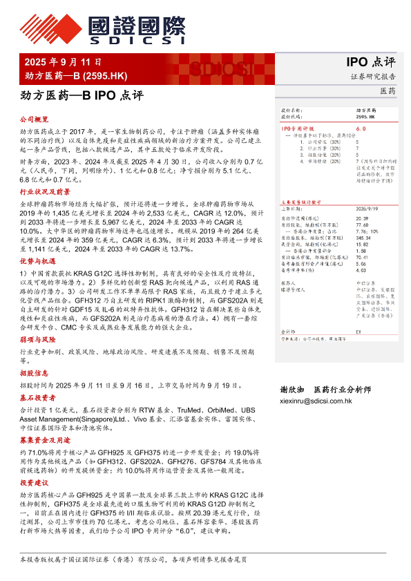 【谢欣汝医药行业分析师xiexinru@sdicsi.com.hk】【20250911】劲方医药-B IPO点评-2页