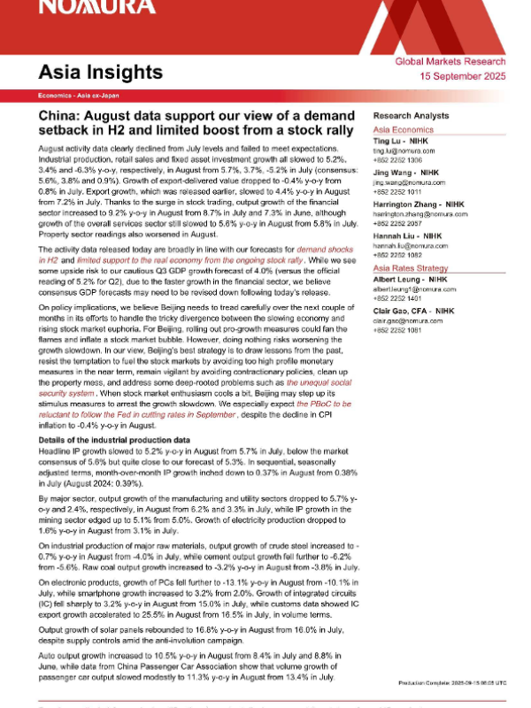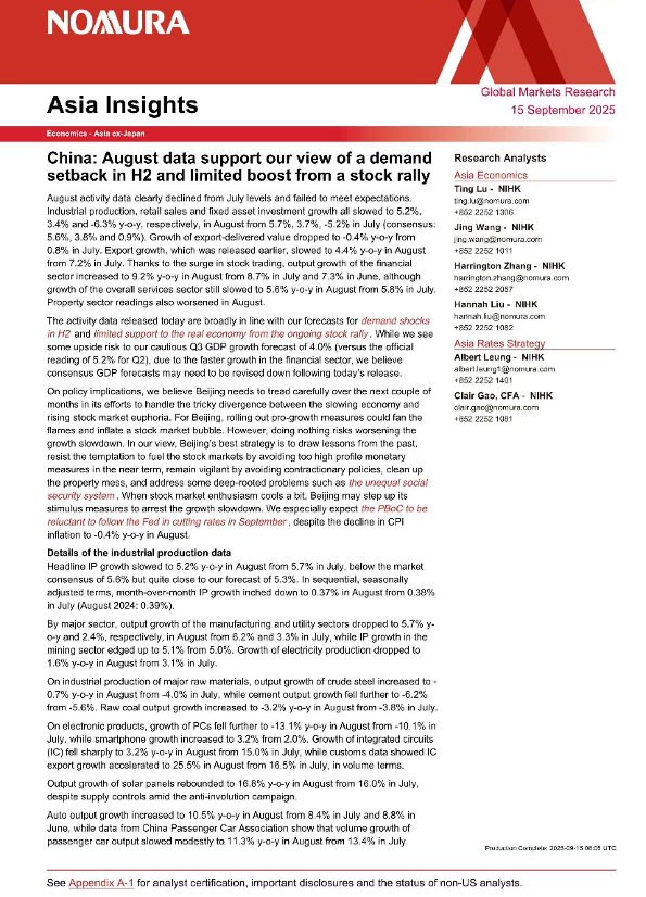 【NOMURA】【20250915】中国:8月数据支持我们对下半年需求受挫以及股市上涨助力有限的观点-10页