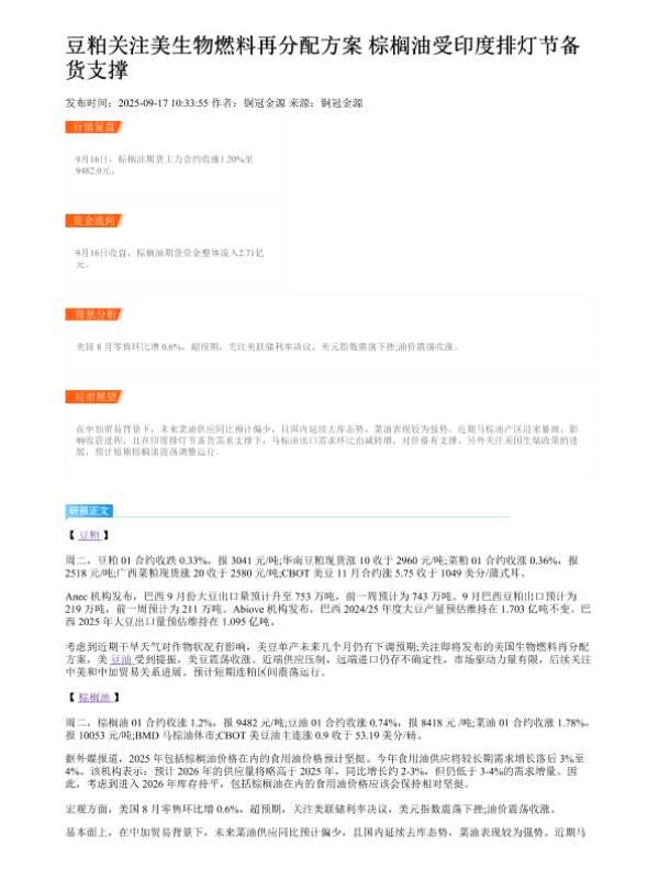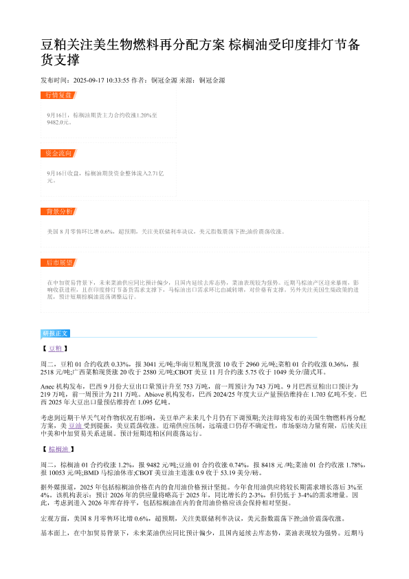 【铜冠金源期货】【20250917】豆粕关注美生物燃料再分配方案-棕榈油受印度排灯节备货支撑-2页