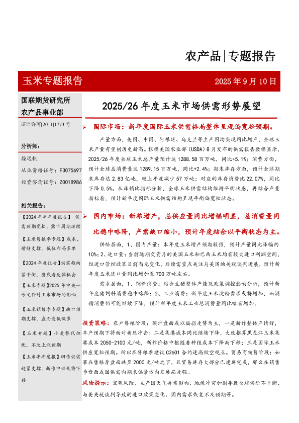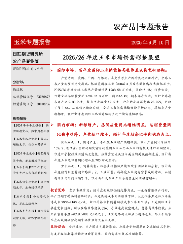【国联期货研究所】【202509】玉米专题报告:2025-2026年度玉米市场供需形势展望-20页