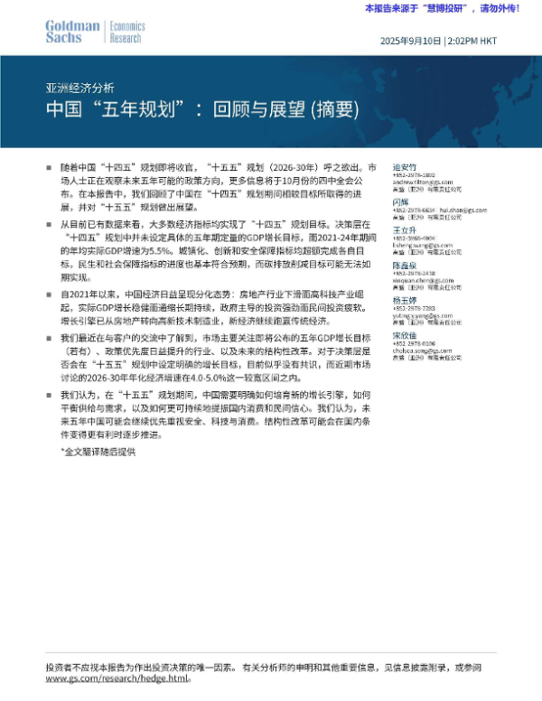 【Goldman Sachs Economics Research】【202509】中国"五年规划":回顾与展望-11页