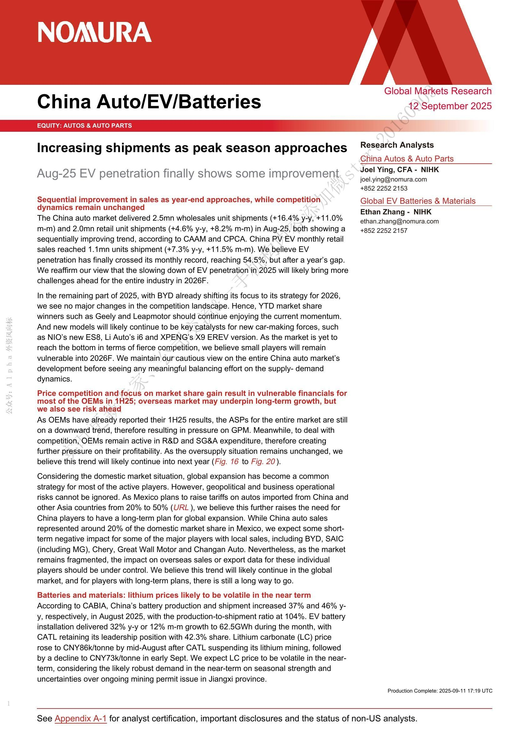 【NOMURA】【202509】Increasing shipments as peak season approaches-Aug-25 EV penetration finally shows some improvement-16页