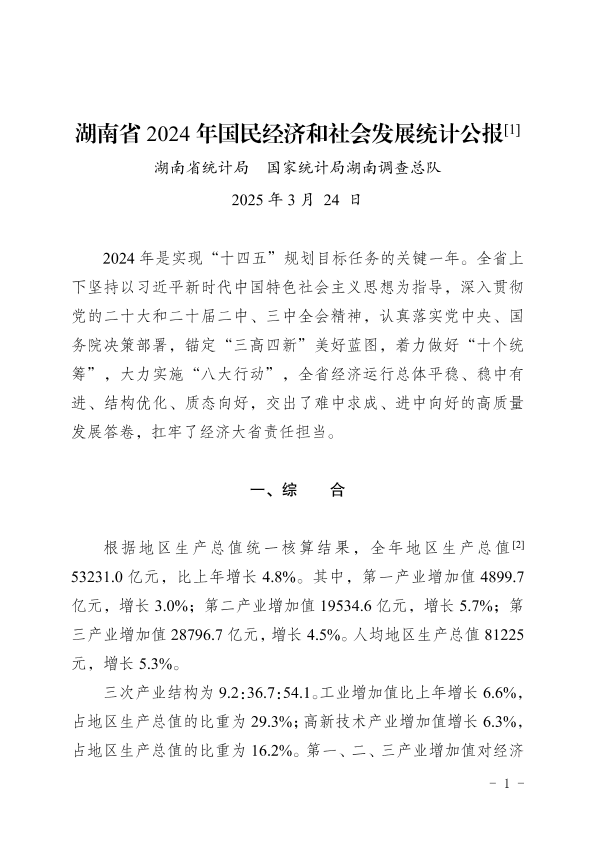 社会发展 国民经济 2024 统计公报 湖南