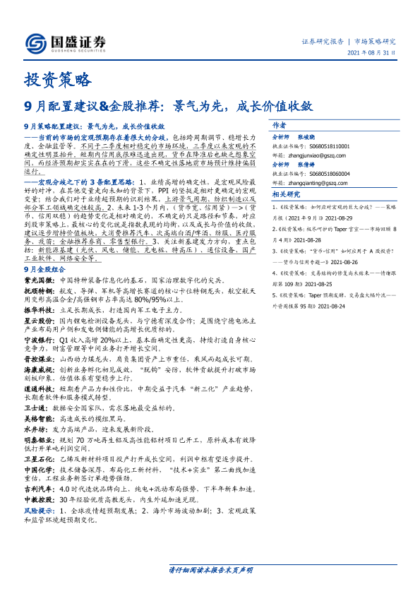 【国盛证券】【20210831】9月配置建议&金股推荐:景气为先,成长价值收敛-16页