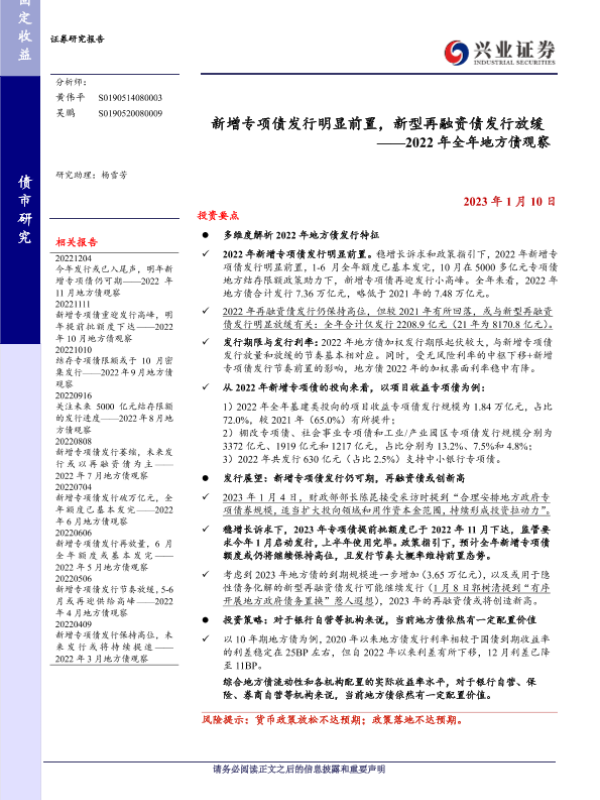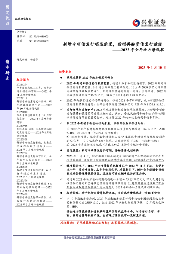 【兴业证券】【20230110】2022年全年地方债观察:新增专项债发行明显前置,新型再融资债发行放缓-16页