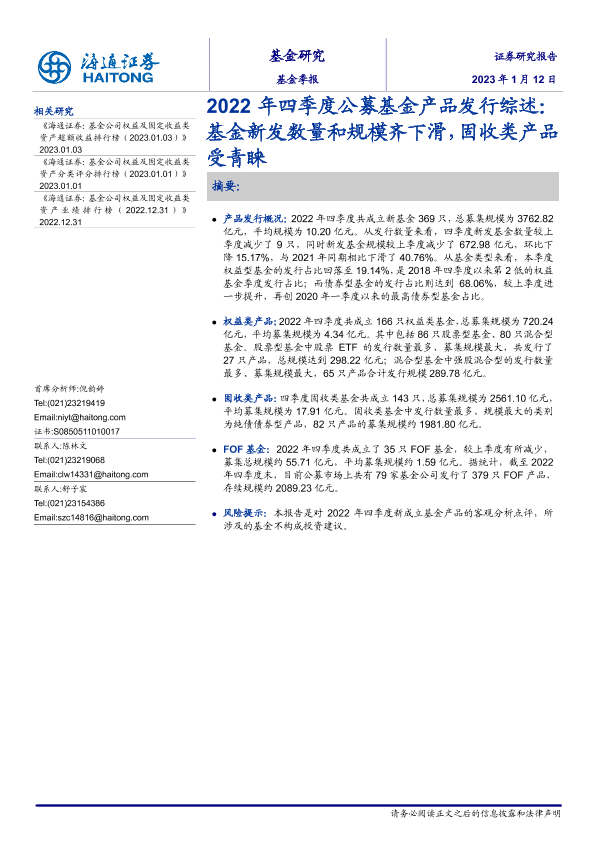 【海通证券】【20230112】2022年四季度公募基金产品发行综述:基金新发数量和规模齐下滑,固收类产品受青睐-16页