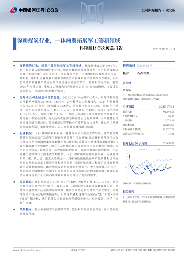 【中国银河证券(CGS)】【20250731】科隆新材-深耕煤炭行业,一体两翼拓展军工等新领域-20页