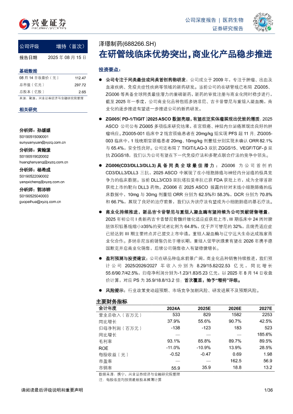 【兴业证券】【20250815】泽璟制药-在研管线临床优势突出,商业化产品稳步推进-36页