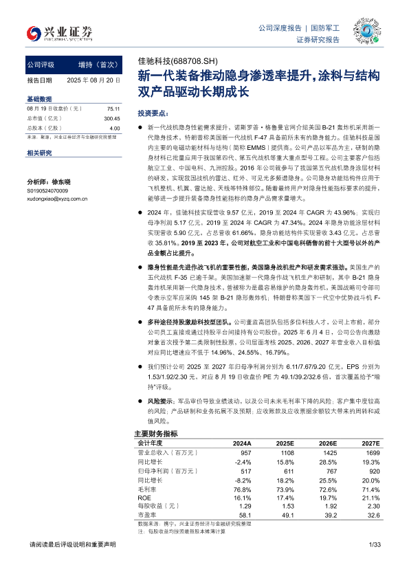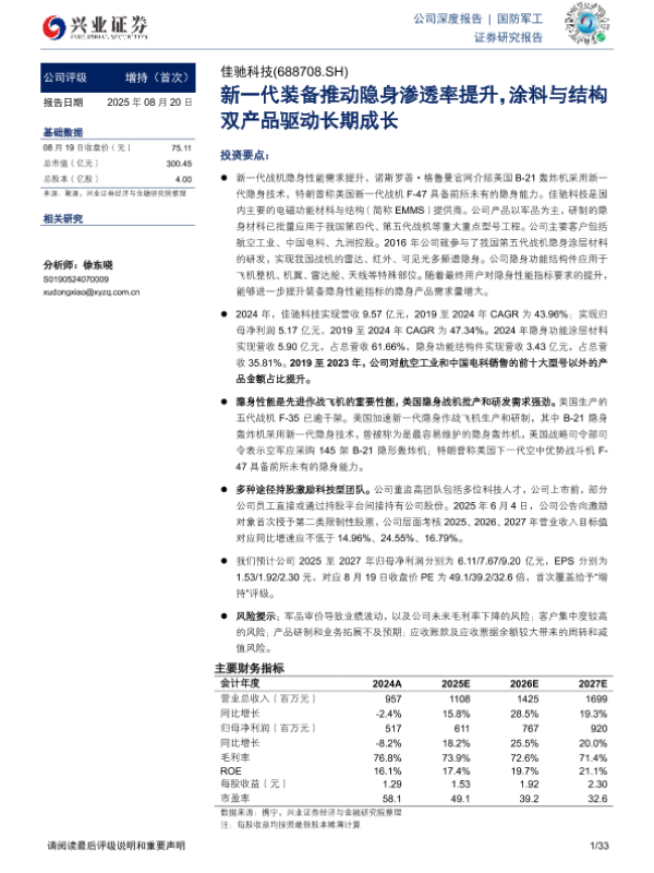 【兴业证券】【20250820】佳驰科技-新一代装备推动隐身渗透率提升,涂料与结构双产品驱动长期成长-33页