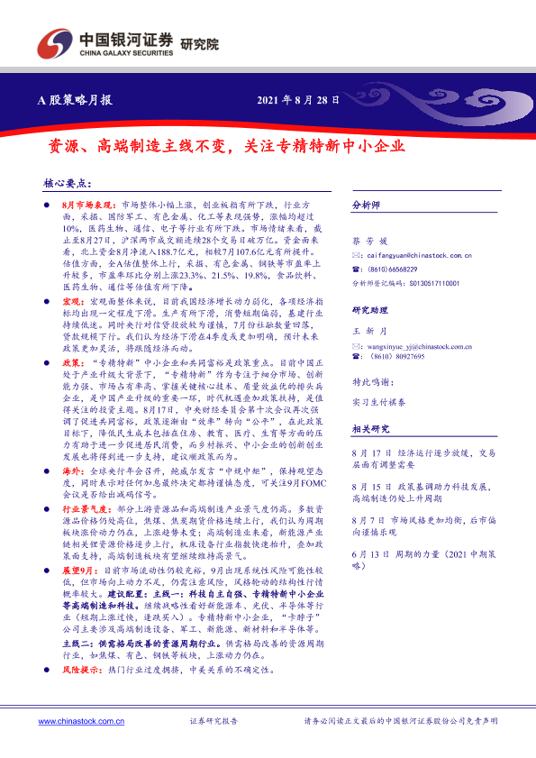 【银河证券】【20210828】A股策略月报:资源、高端制造主线不变,关注专精特新中小企业-17页