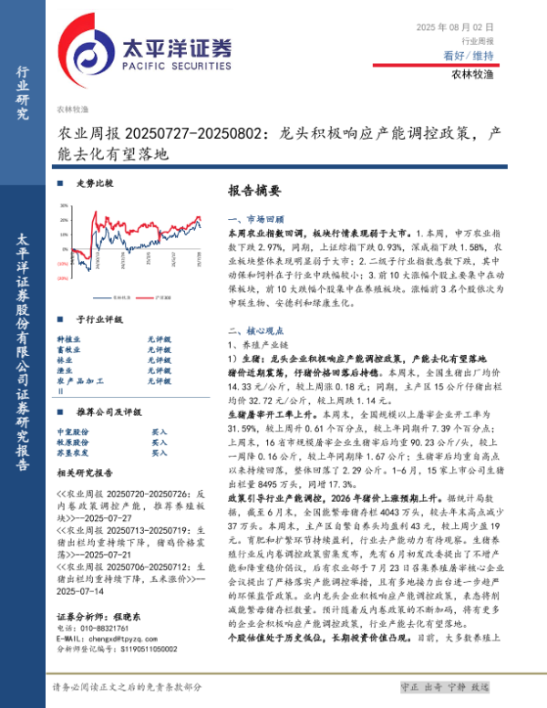 【太平洋证券股份有限公司证券研究报告】【20250802】农业周报 20250727-20250802:龙头积极响应产能调控政策,产能去化有望落地-18页
