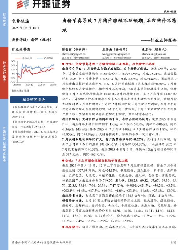 【开源证券】【20250814】农林牧渔行业点评报告:出猪节奏导致7月猪价涨幅不及预期,后市猪价不悲观-13页