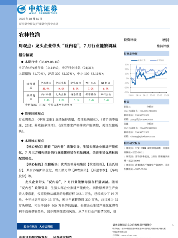 【中航证券】【20250816】龙头企业带头"反内卷",7月行业能繁调减-13页