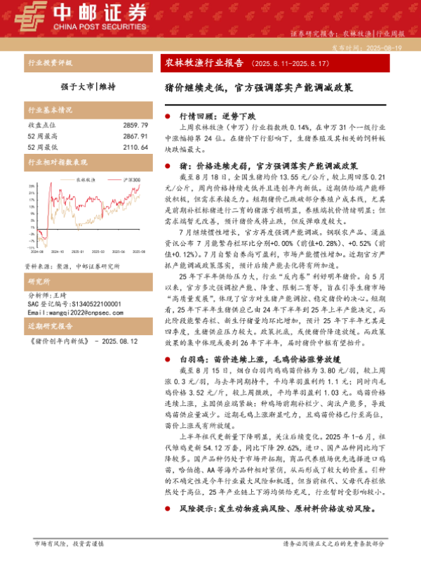 【中邮证券】【20250819】农林牧渔行业报告:猪价继续走低-官方强调落实产能调减政策-12页