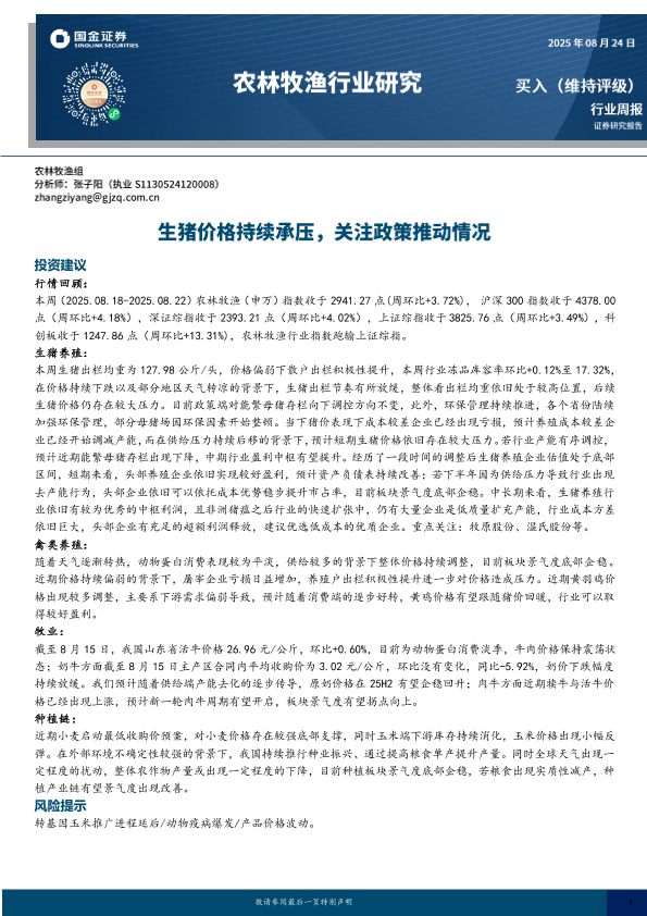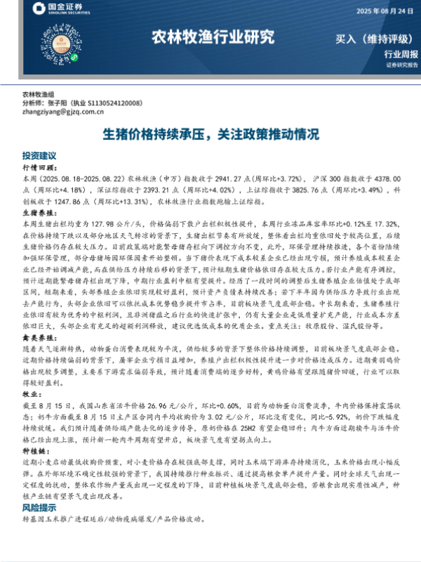 【国金证券】【20250824】农林牧渔行业周报:生猪价格持续承压,关注政策推动情况-13页